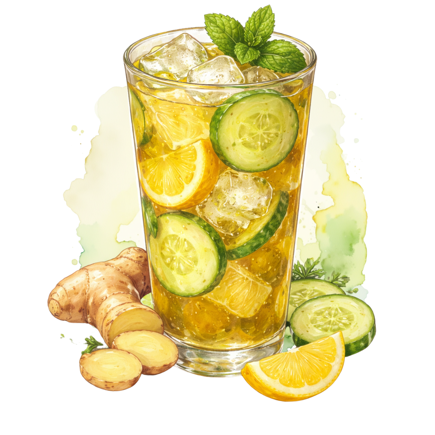 The result is a light, functional refresher that supports hydration, digestion, and gentle energy. Green tea provides a smooth, antioxidant-rich base with a soft caffeine lift, while fresh ginger brings warmth and digestive support. Cooling cucumber keeps the drink clean and balanced, making it refreshing without feeling sharp or heavy. Lightly sweetened — or enjoyed as-is — it’s an easy way to rehydrate without excess sugar.