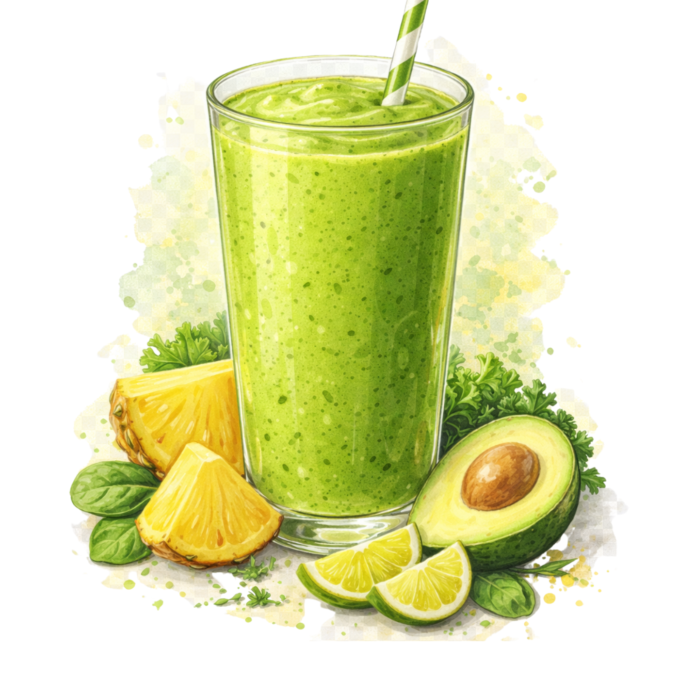 Sweet pineapple meets the tang of fresh lime, blended with creamy coconut and grounded by a handful of kale and spinach — added not to overpower, but to quietly support the body with nourishment that blends right in. The result is tropical, refreshing, and surprisingly balanced.